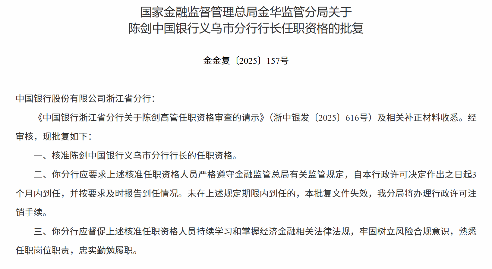 12月26日,国家金融监督管理总局金华监管分局发布关于陈剑中国银行义乌市分行行长任职资格的批复,核准陈剑中国银行义乌市分行行长的任职资格。