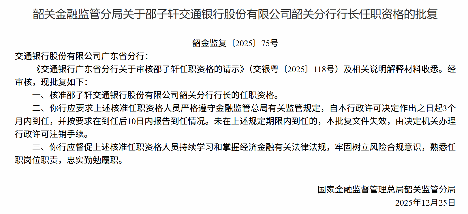 12月26日,韶关金融监管分局发布关于邵子轩交通银行股份有限公司韶关分行行长任职资格的批复,核准邵子轩交通银行股份有限公司韶关分行行长的任职资格。